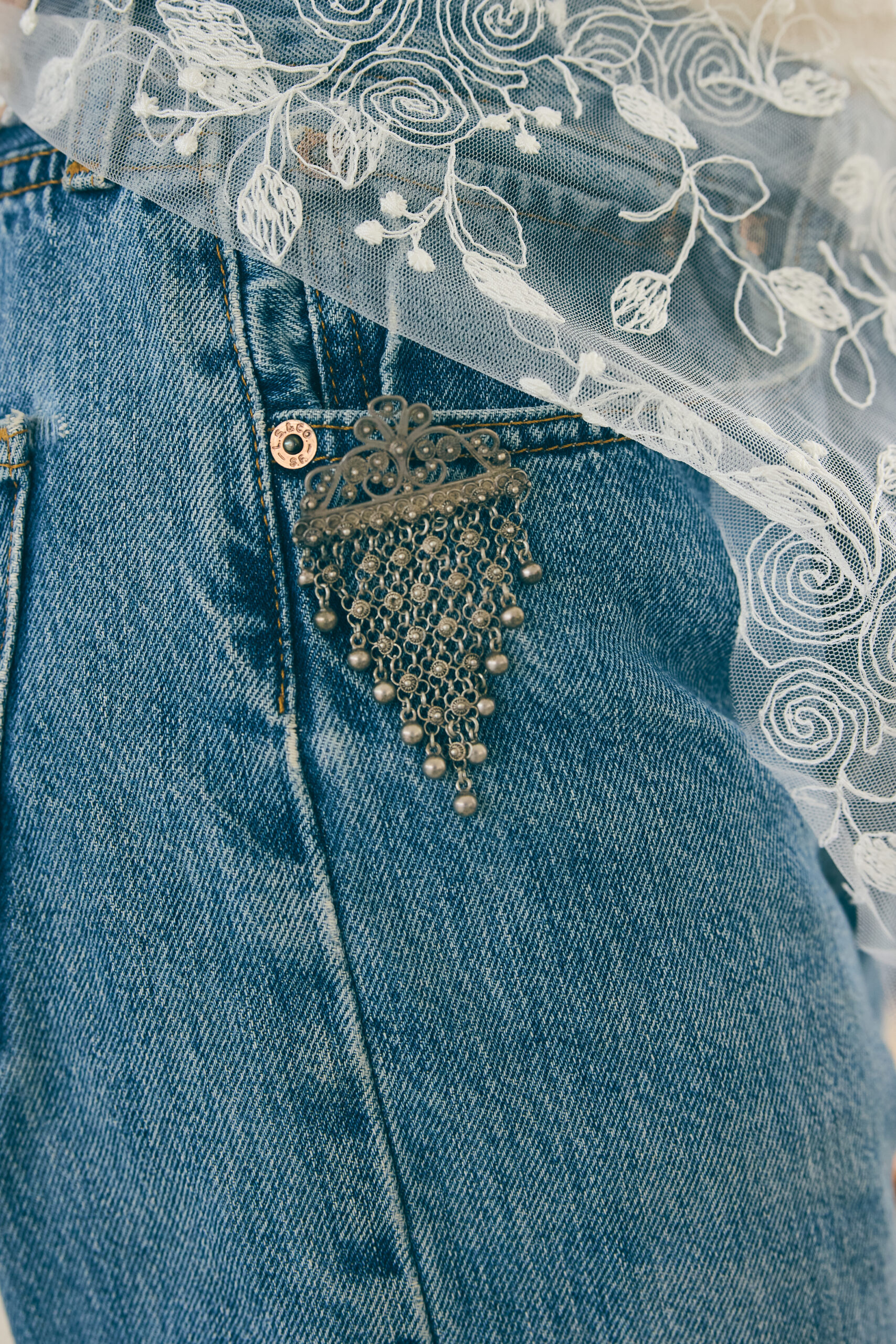 Description: Antique silver brooch with dangling details. Engraved Johanne Petersen, from the 1920’s.