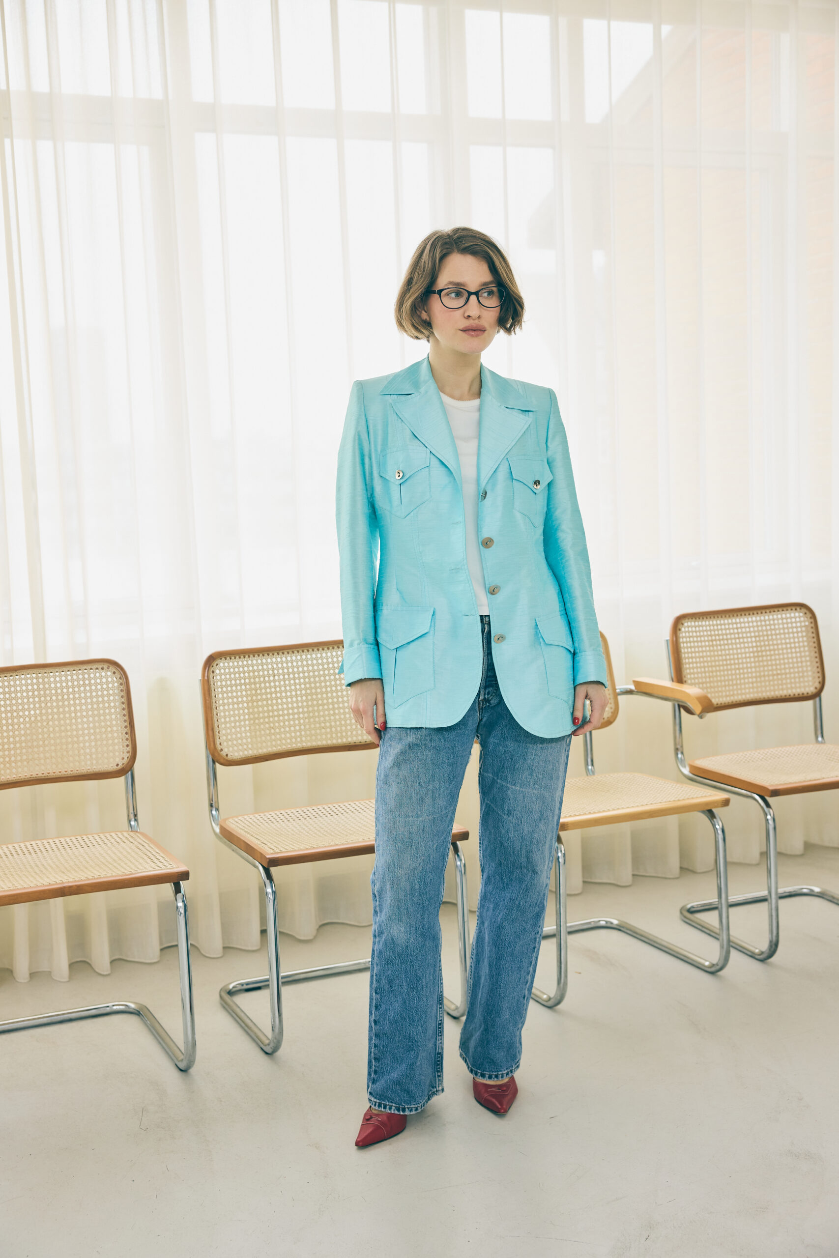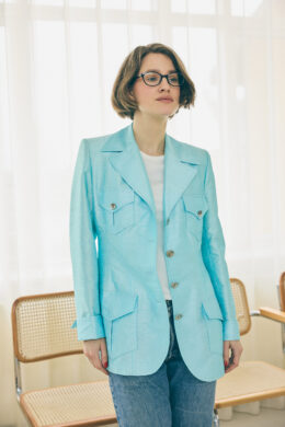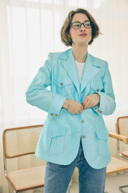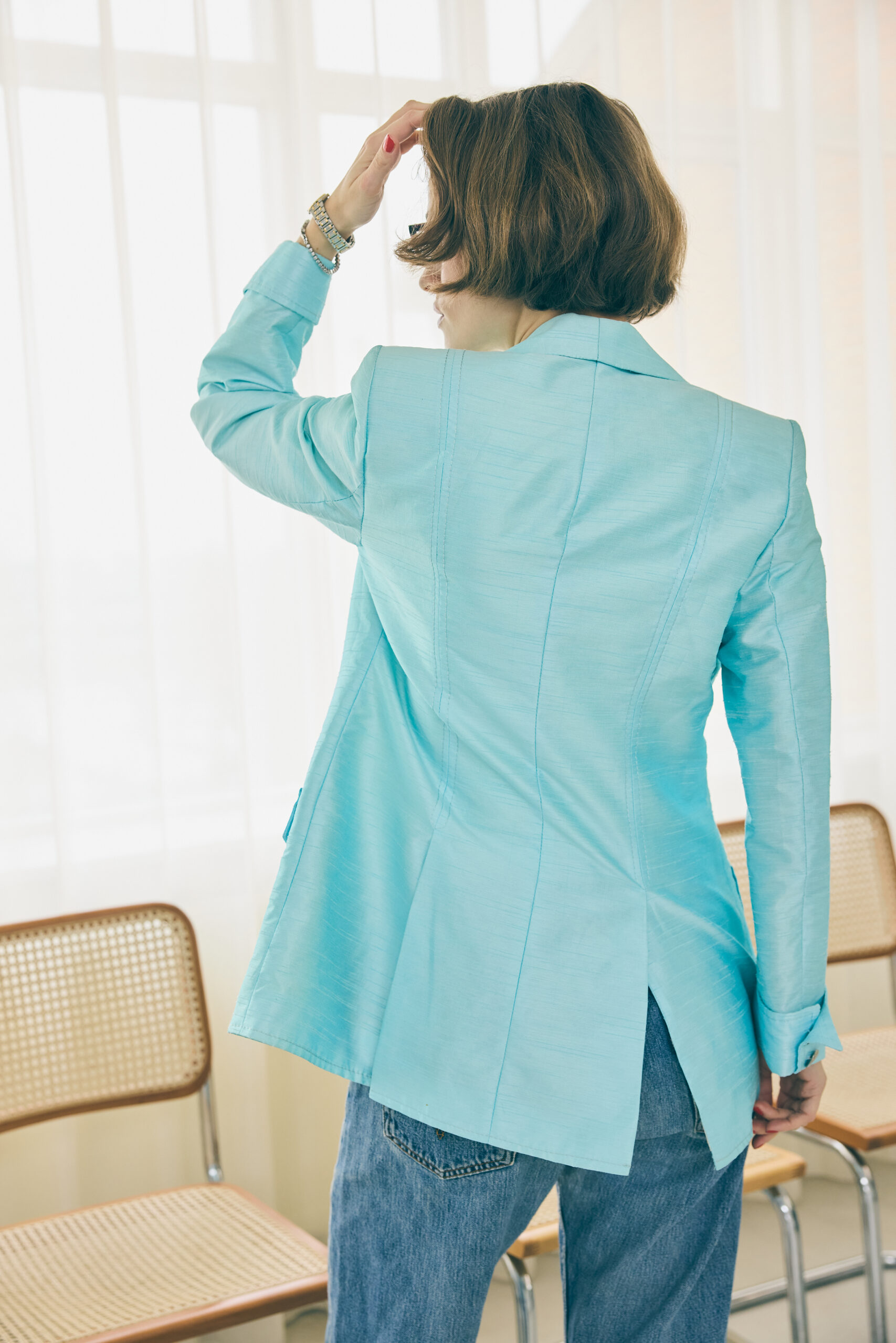 Description: Boxy light blue blazer jacket in silky look with unique details and decorative buttons. festures four pockets and decorative buttons and stitching. Tailormade details and a slightly oversize fit which makes a great contrast to the shine light blue material. We recommend styling it with linen, wool og denim to play with some contrast or to use it as your new favourite everyday spring jacket. Fits size EU36-40