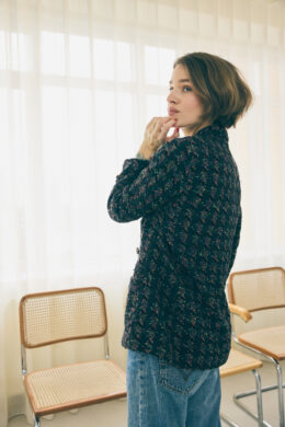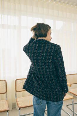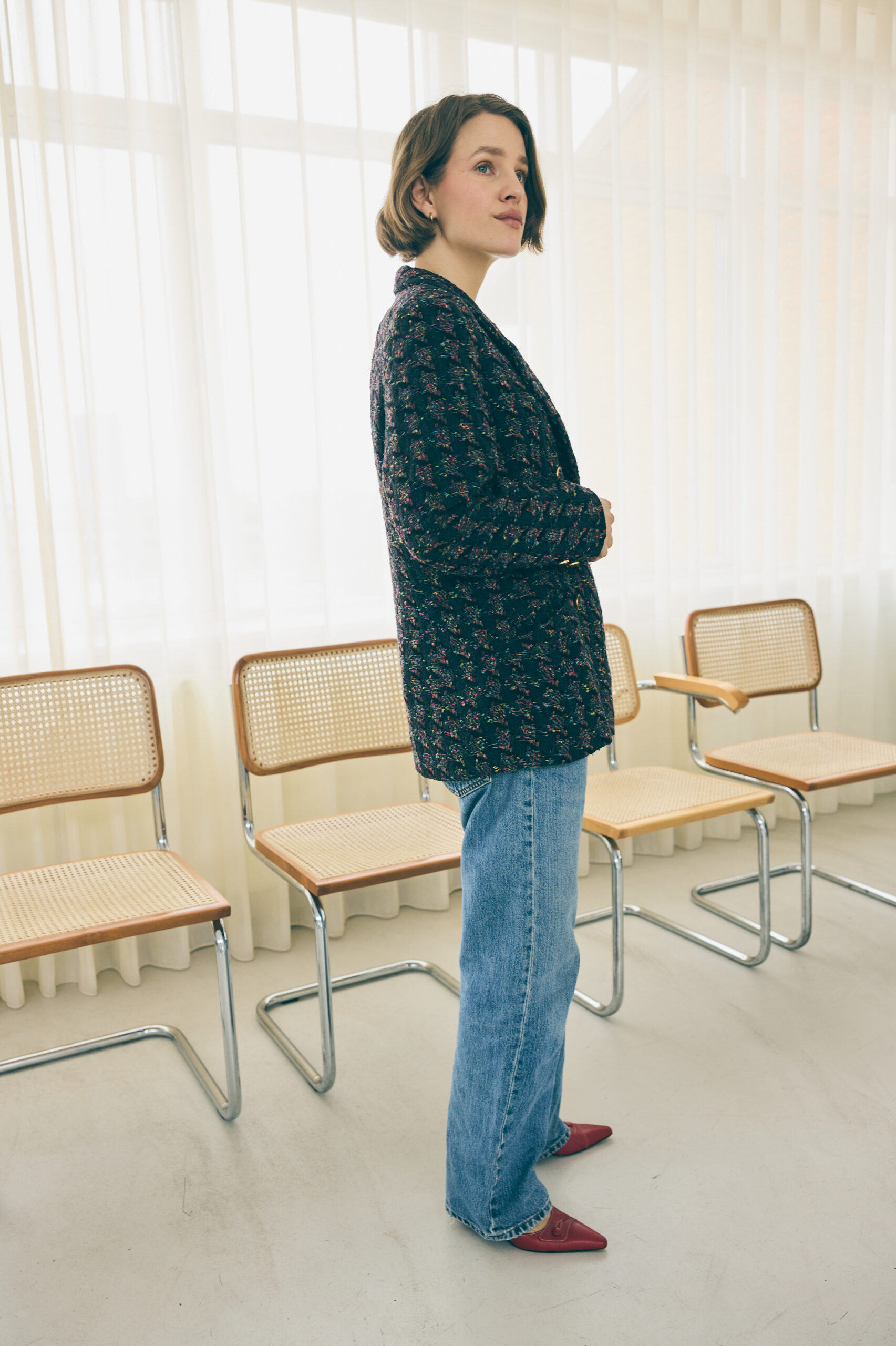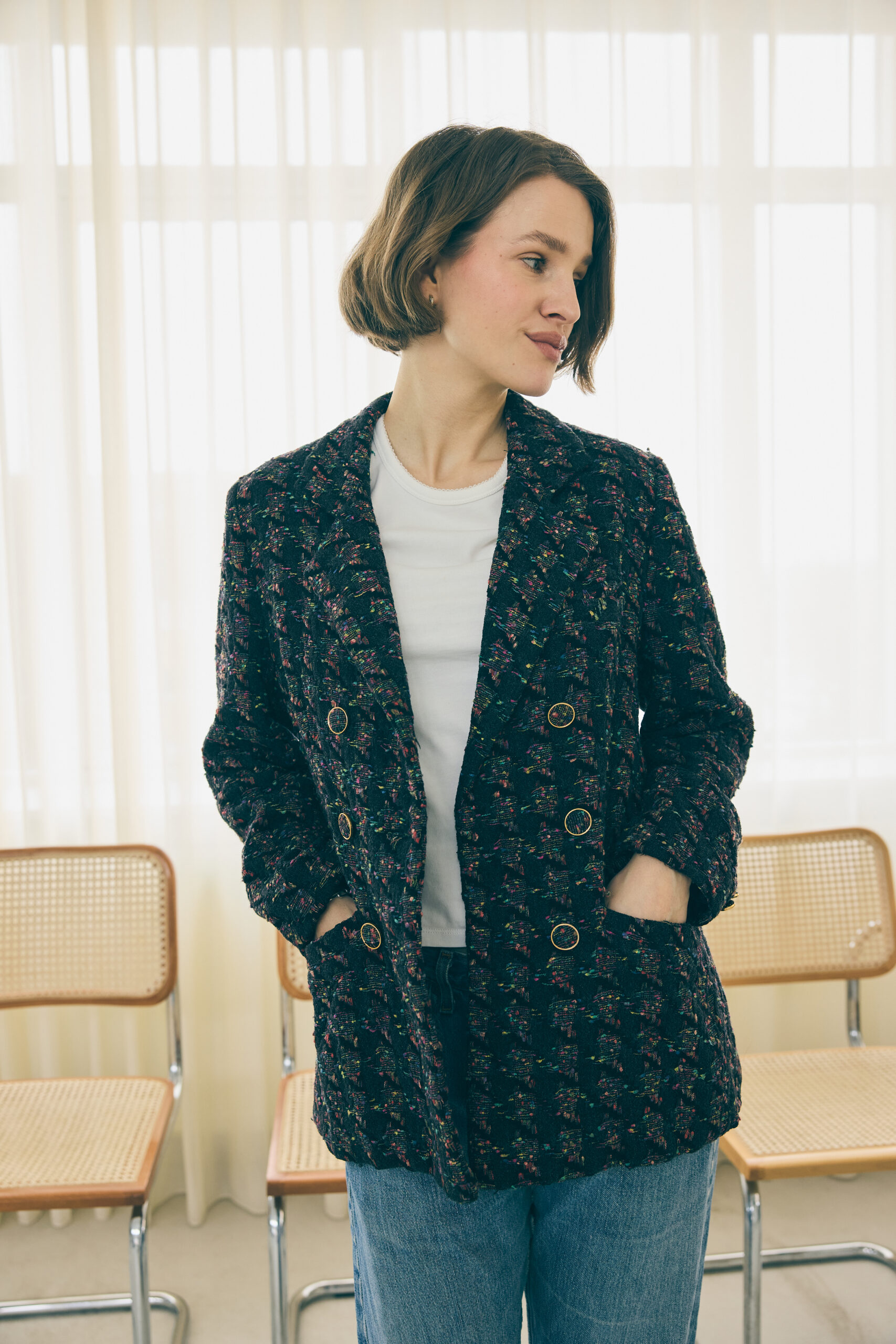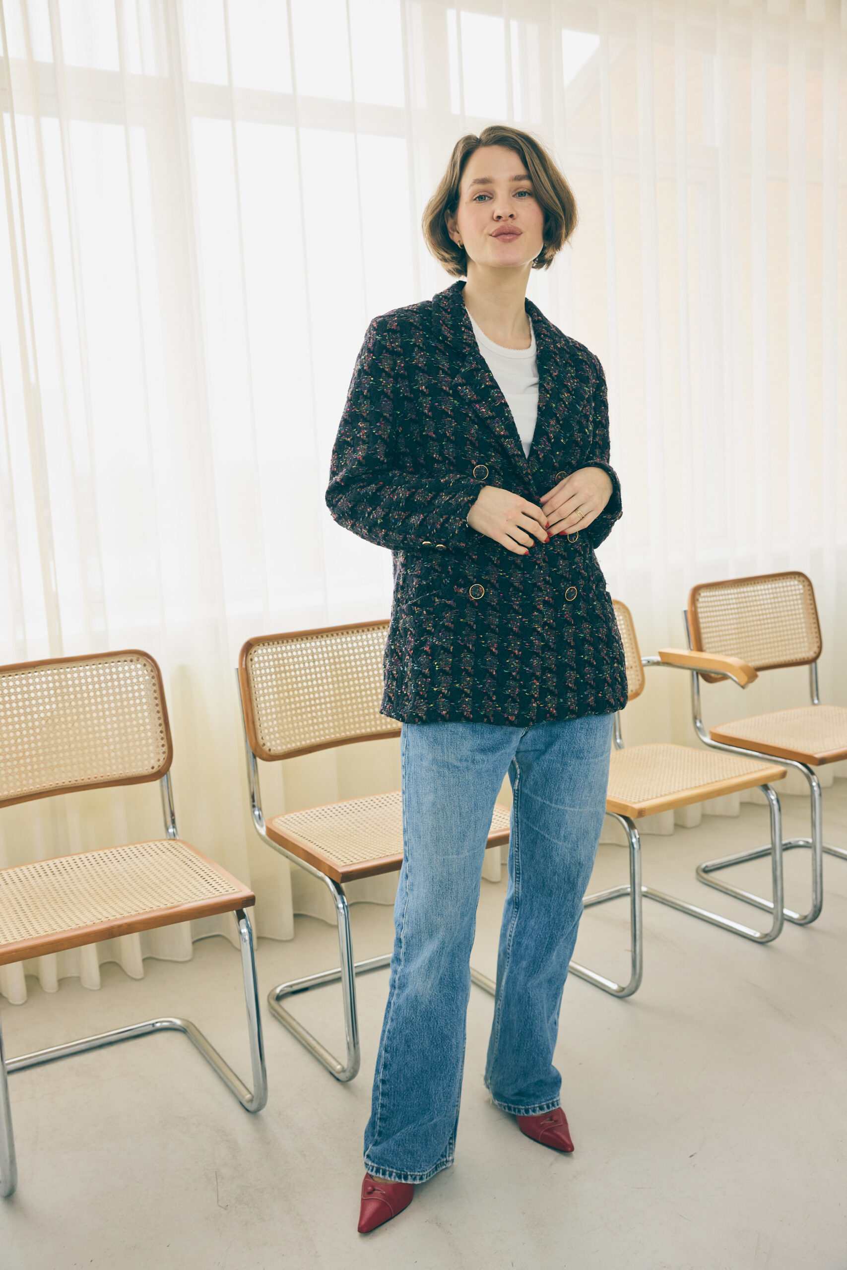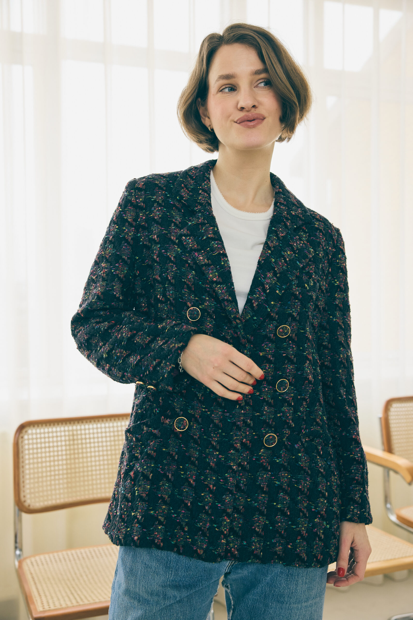 Description: Bouclé blazer in slightly oversized fit in various bold yet elegant colours, with shoulder pads, 3 pockets and covered buttons. We recommend wearing it with a narrow shirt, your favourite pair of jeans and a pair of sandals. Fits size EU36-40.