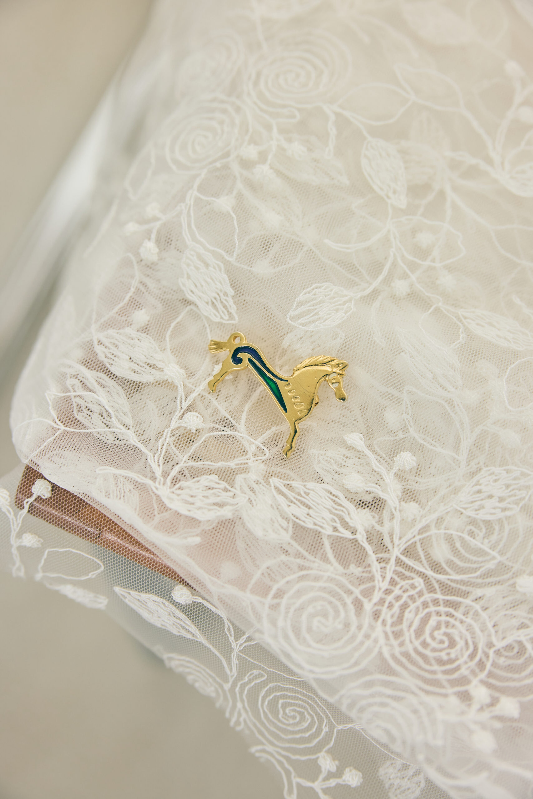Description: Small silver horse brooch with blue and green enamel from 1973. Easy to wear where you want. We recommend styling in with denim or on your favourite blazer.