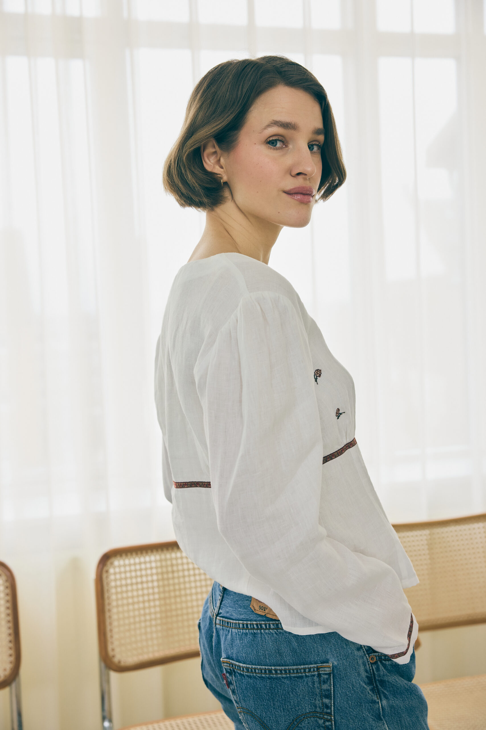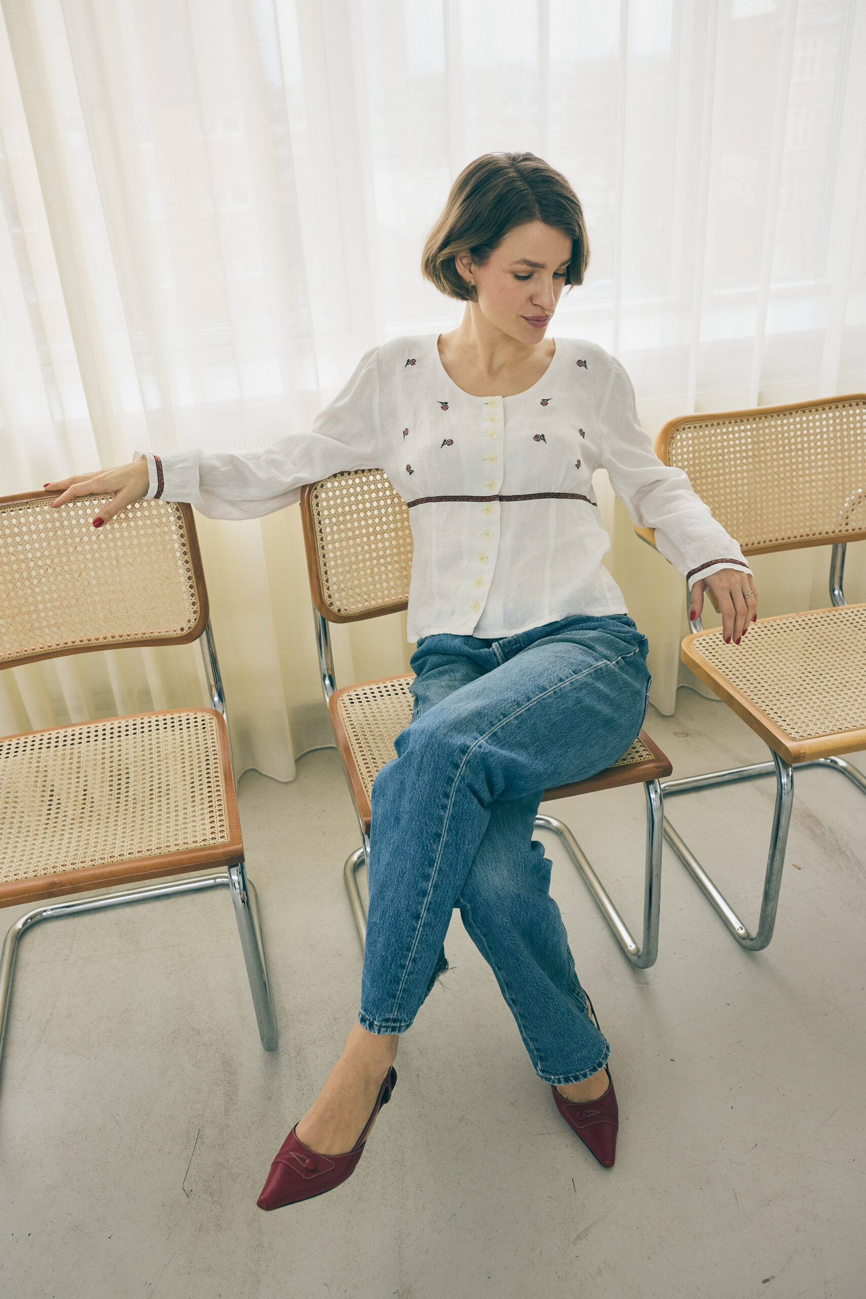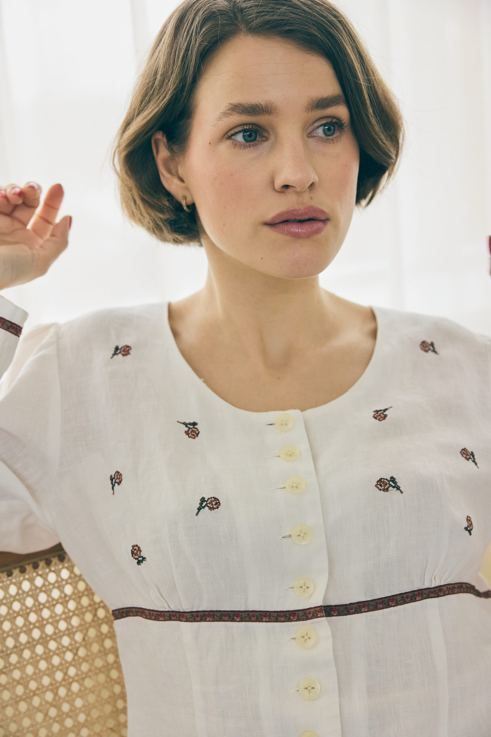 Description: Delicate and feminine white linen shirt with buttons and embroidery. We recommend wearing it with a pair of loose fitted jeans or with your favourite pair of linen pants for a South of France kinda vibe. Fits size 36-38.