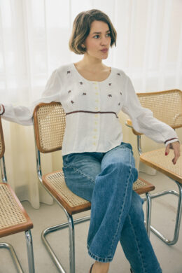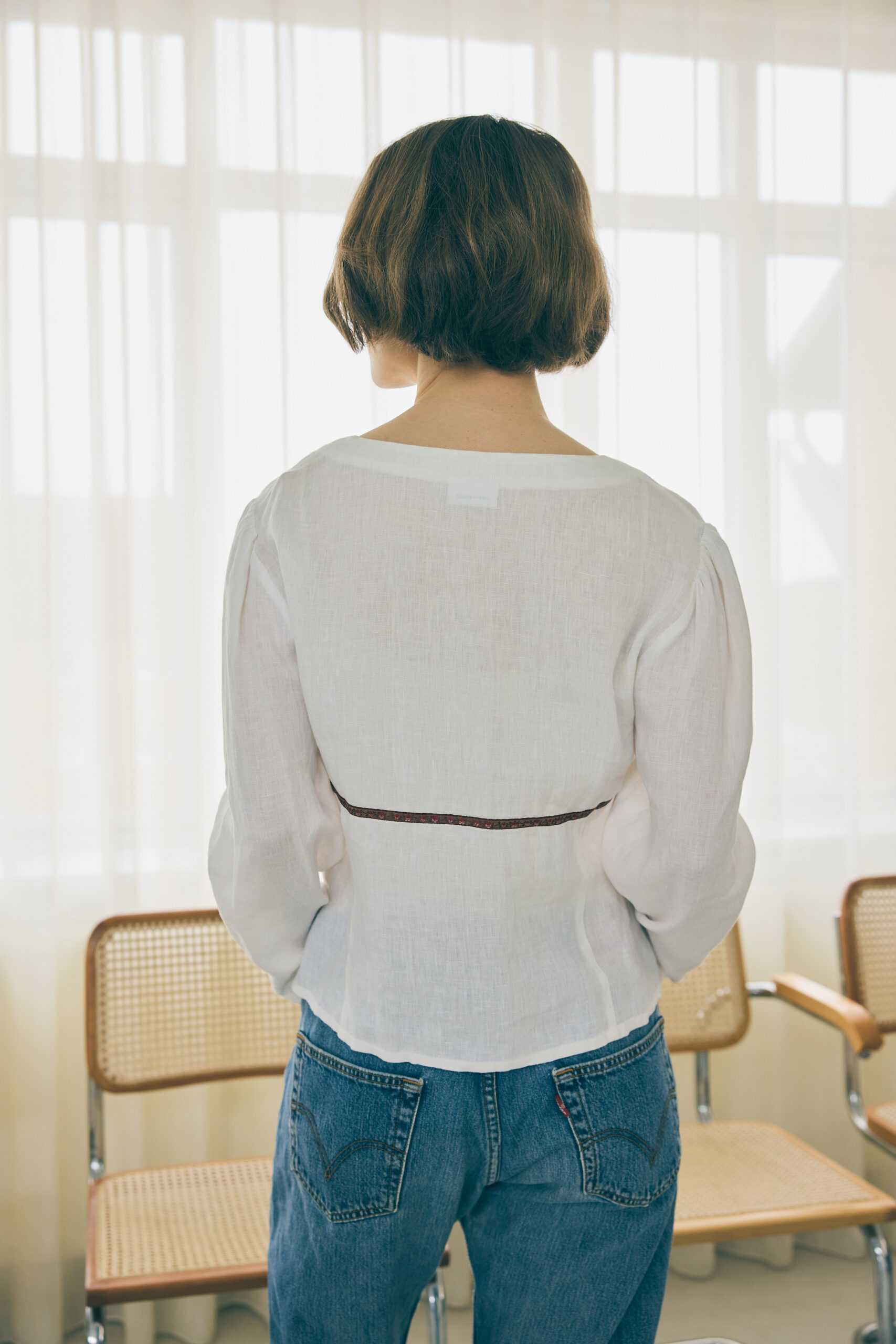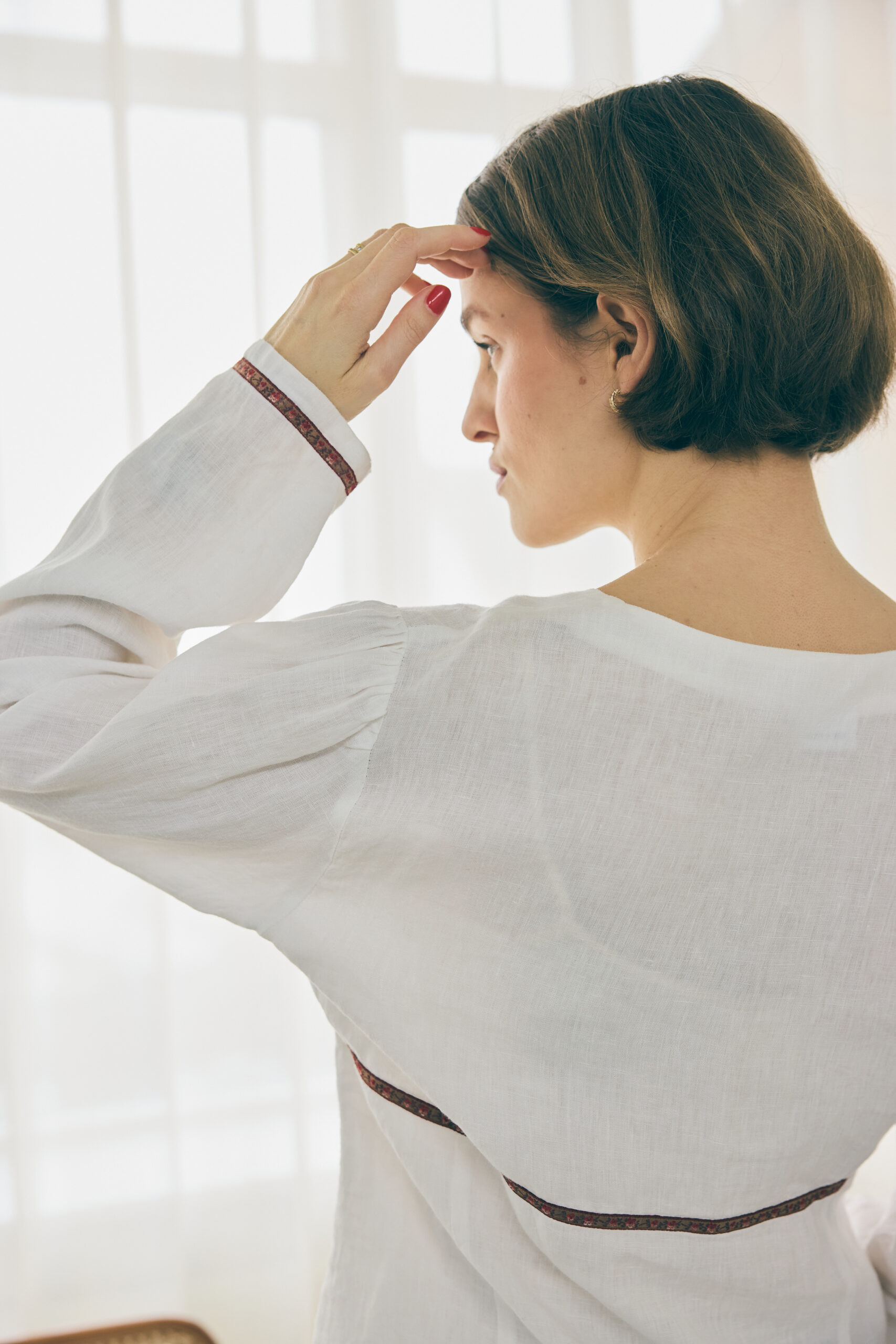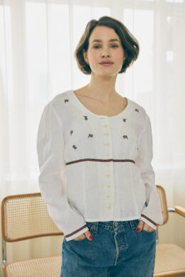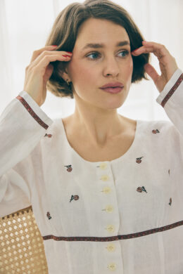 Description: Delicate and feminine white linen shirt with buttons and embroidery. We recommend wearing it with a pair of loose fitted jeans or with your favourite pair of linen pants for a South of France kinda vibe. Fits size 36-38.